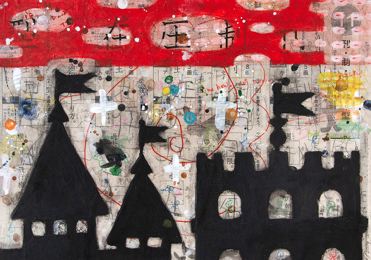 様々な役割に忙殺されていく日々に、ふと、目の前に捨てられずに溜まっていく、子どもたちの古着や返却された学習プリントがありました。「なんで捨てられないのだろう」と悩むと、そこに沢山の大切な何かが詰まり、滞っているように感じました。それを確かめるためにそれらを支持体に制作を始めると、そこに役を着た「私」が置き忘れていた「私」がそこに在るように感じました。